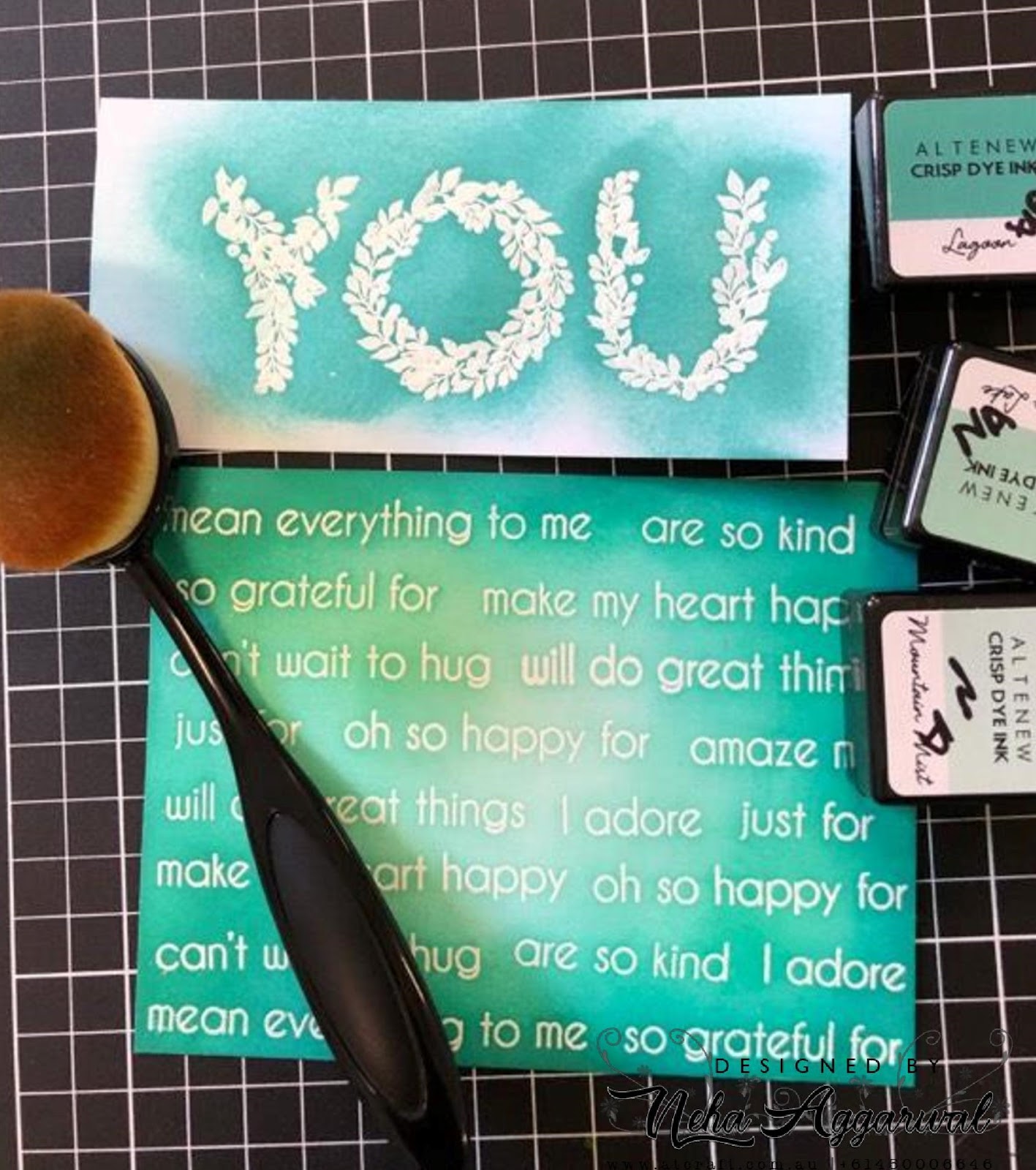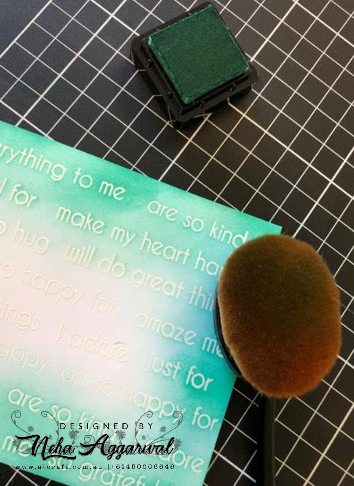 After finishing my heat embossing I have used Picket fence Blending brush to do my background . I have used the ink pads from Altenew which are lagoon, Volcano lake, and Mountain Mist.