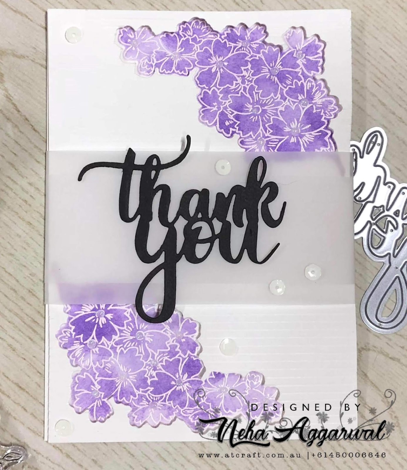 In this card I have used the Altenew Starry flower along with its matching dies. Word Thank you is also used from one of the Altenew Thank you dies. The starry flower was also embossed with the white Embossing powered and flower centers are done with nuvo drops.