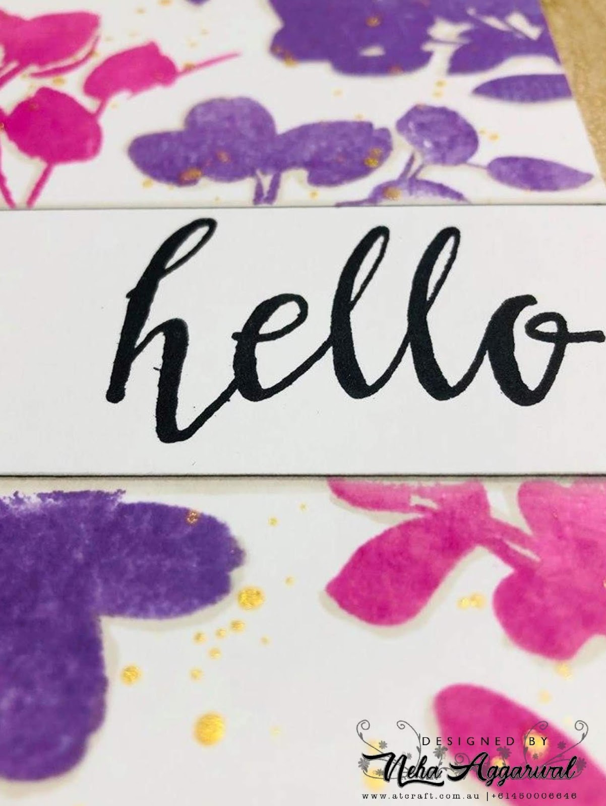 - Once this was all done I went ahead and stamped the sentiment on the side by using the word “hello” from Halftone Hello.