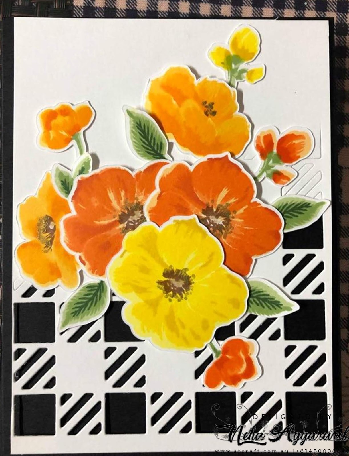 - I stamp all my flowers and leaf using the layering guide which was provided on the back of the Climbing Clematis stamp. I have used mini ink cubes: warm and cozy, Golden sunset and Pocketful of sunshine for flowers, for leaves I have used Green Field.