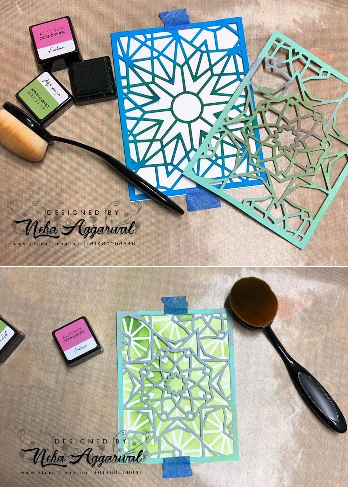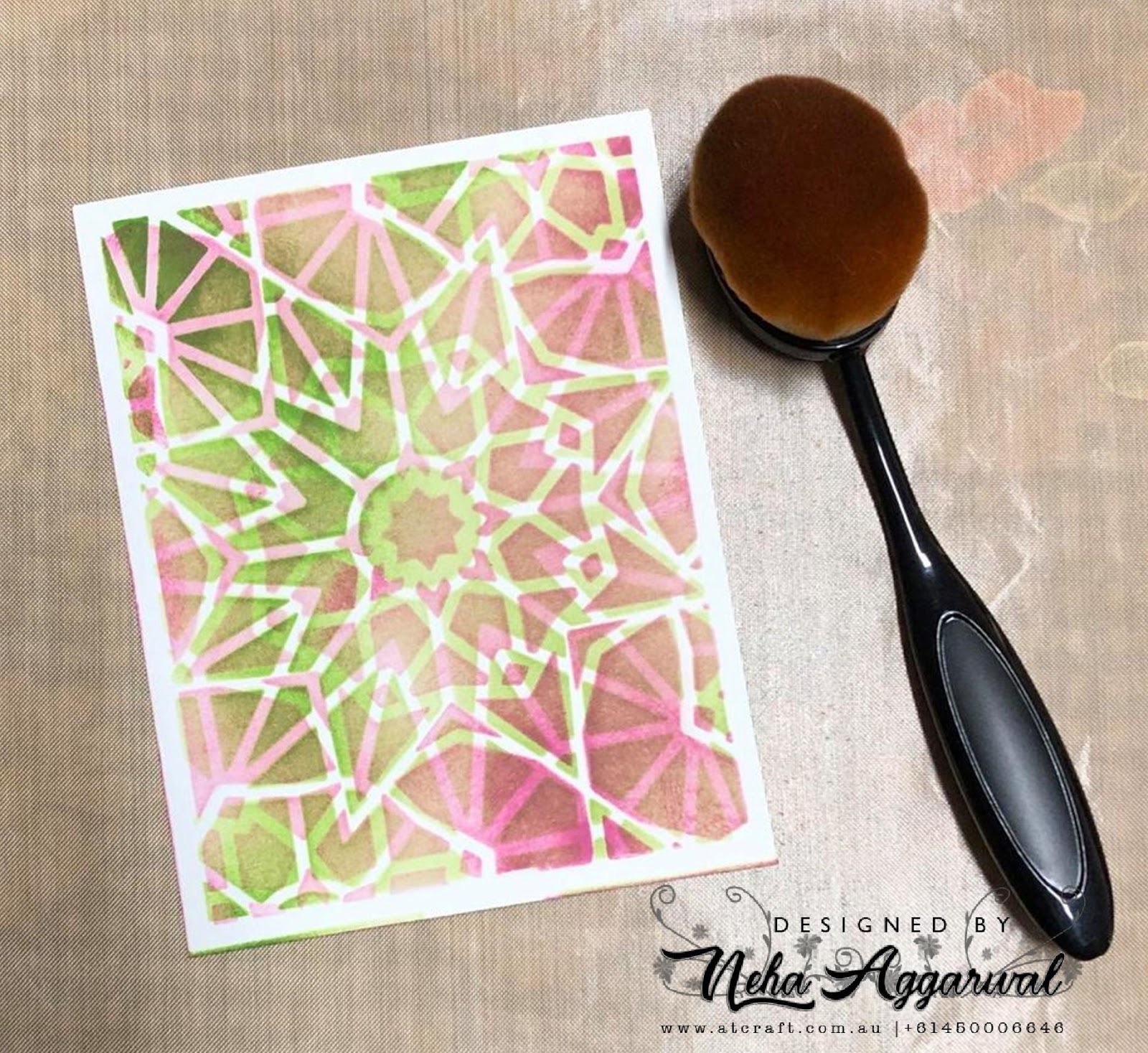 - I first used fresh lime Ink pad and then Fusia ink with my respective stencils.