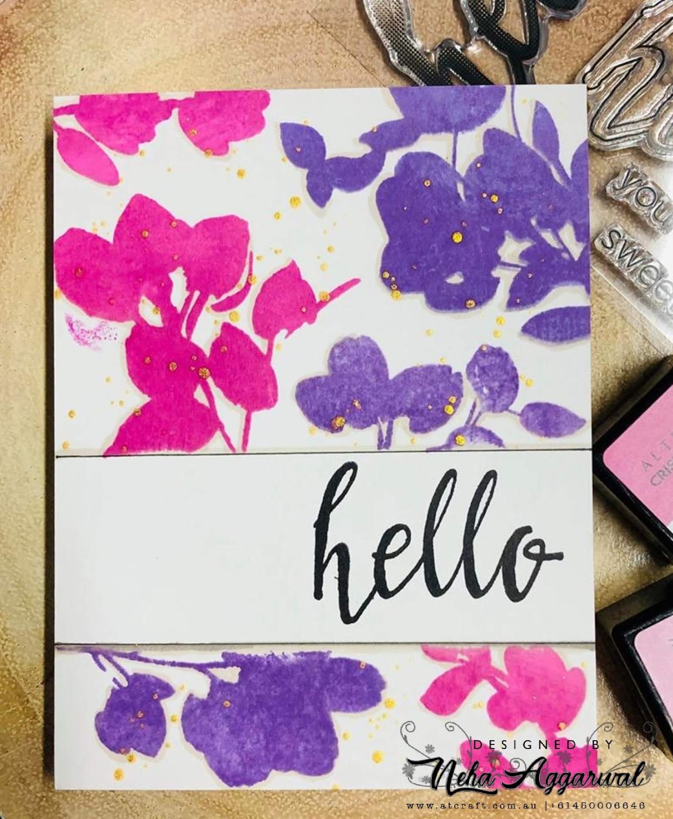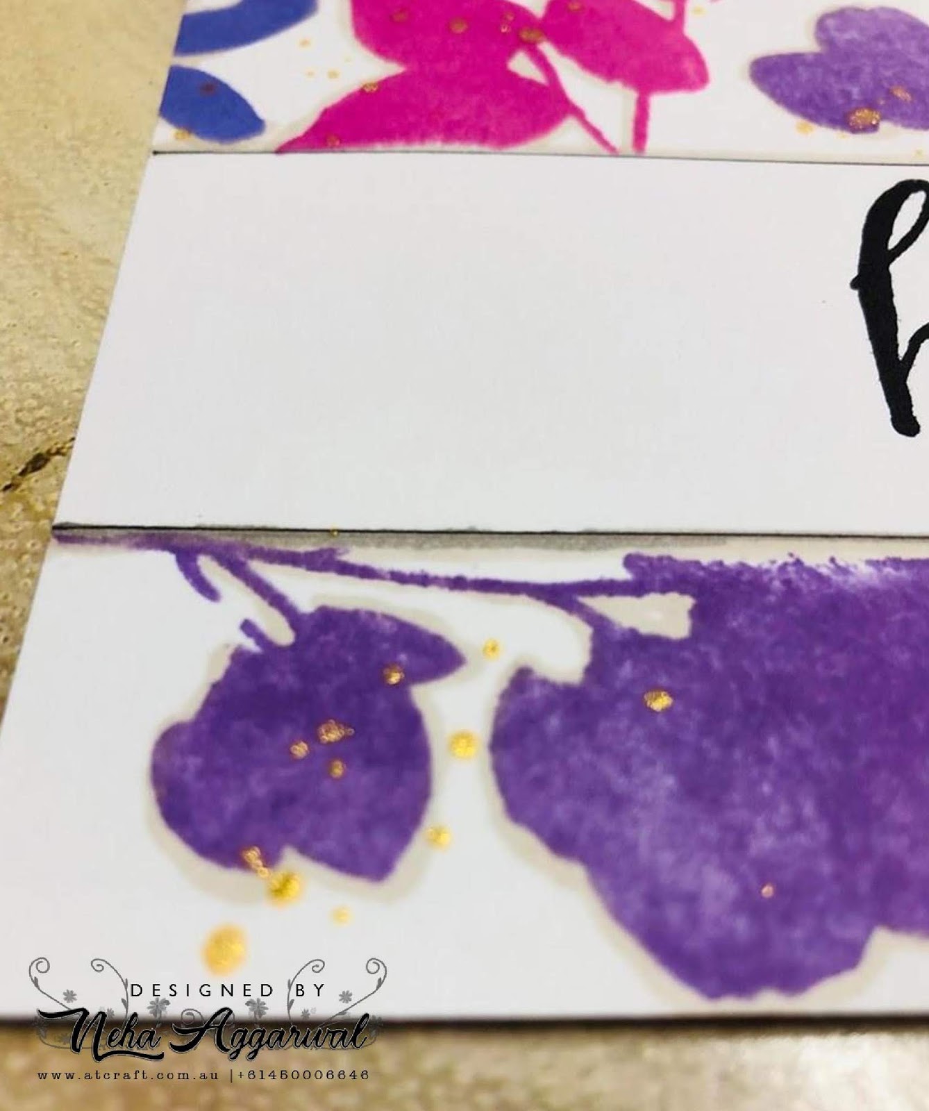 - Now placing my stamps where I needed on the Neenah cardstock 4 ¼’ x 5 ½’ and stamped the different stamps with the inks from Shades of Purple and spring bouquet pink shades. I used two shades from each colour family.