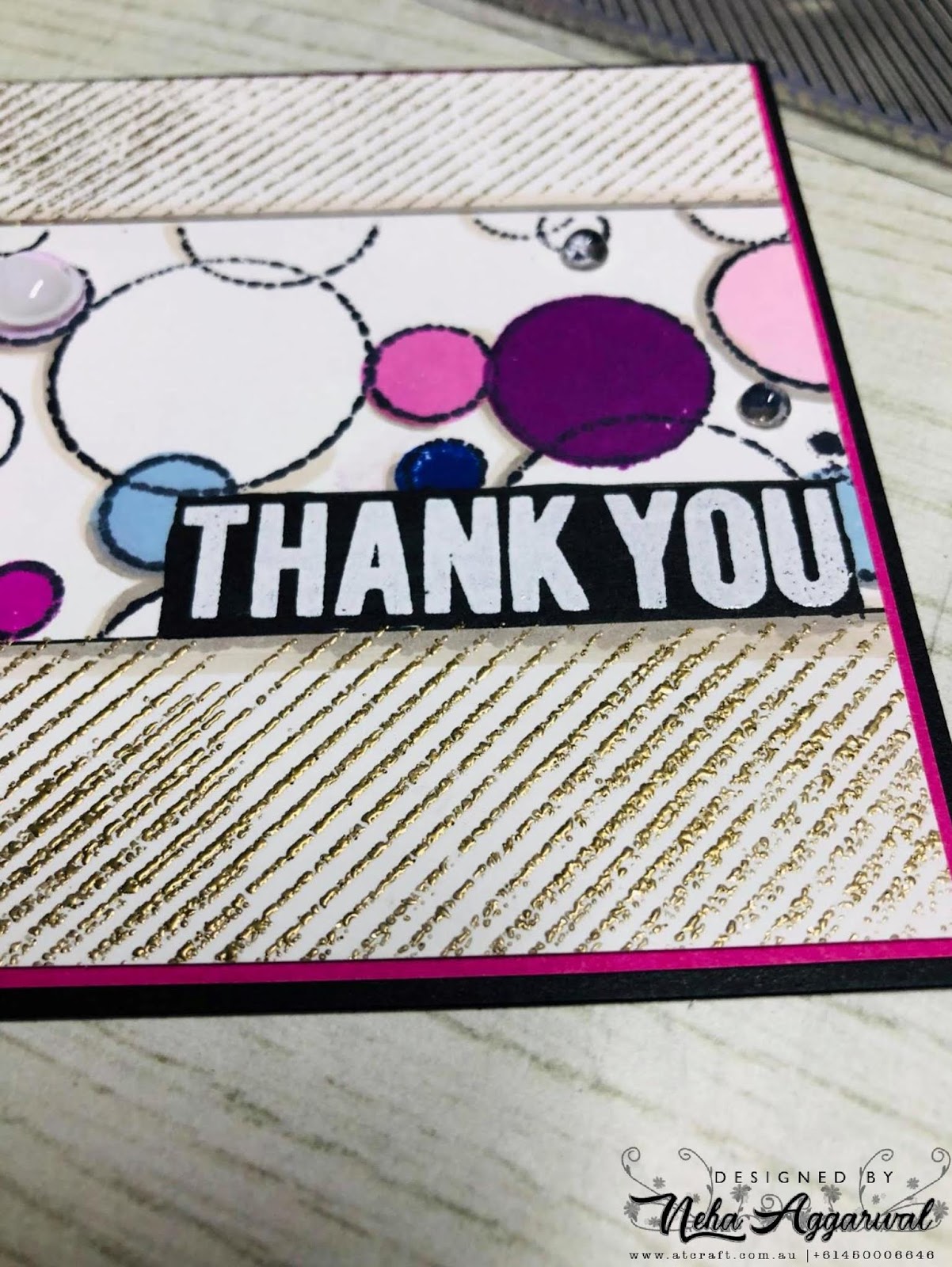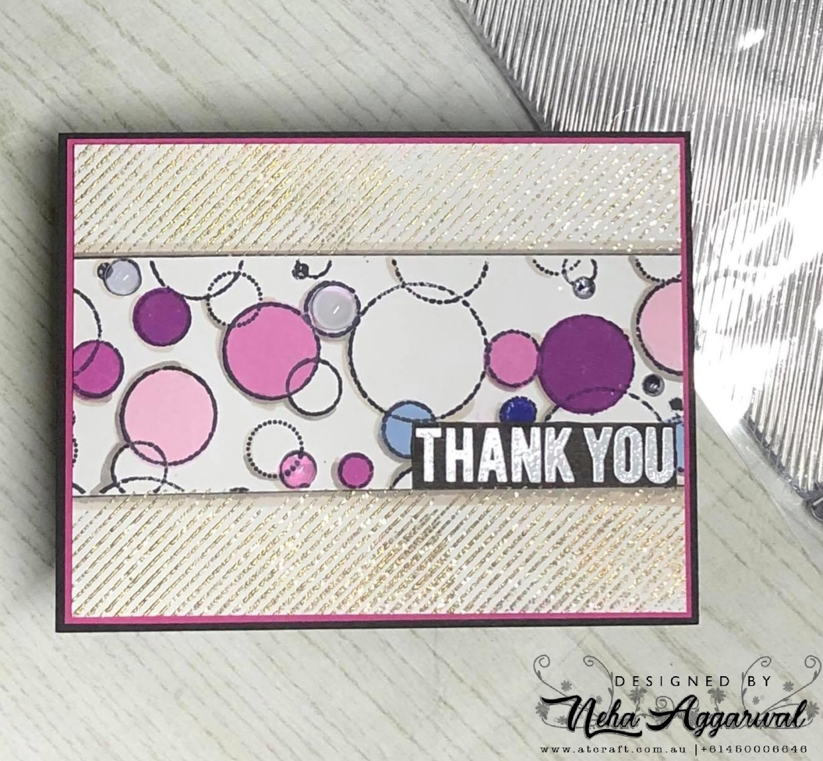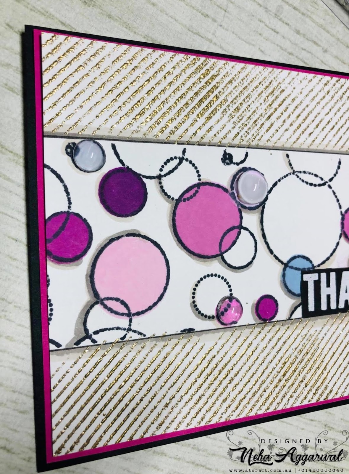 Once that is heat embossed then I masked both top and bottom again to stamp my Circle pattern for the middle using Altenew jet black Ink pad. I have also used the different circle shapes from circle pattern Stamp to fill my colours in the random circles (blue and pink).