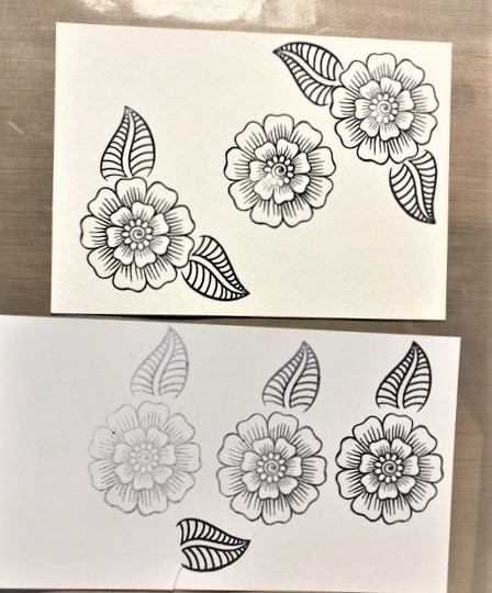 First I took a stamp from the Henna element and stamped them in a diagonal pattern on Nina Solar white along with its leaves. On a masking sheet I stamped flowers and leaves to cover the stamped images which I stamped on Nina solar white.