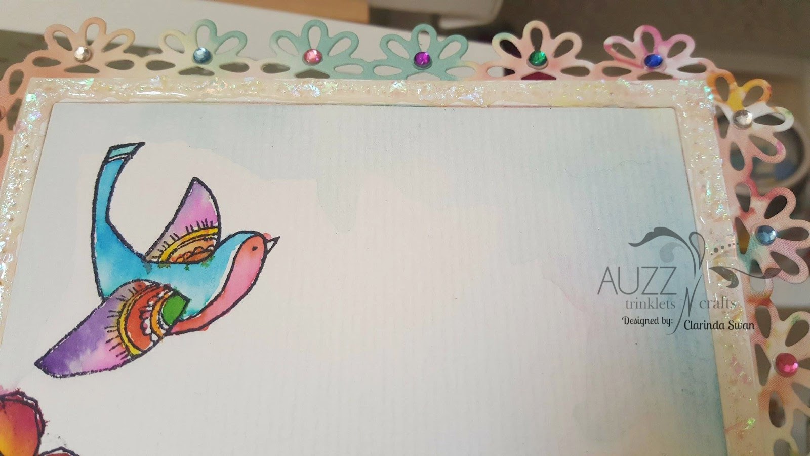I then cut the inner two pieces of watercolour cardstock using the next die down in the set. the inner square frame I covered in crystallina glitter glue and used that to stick down pieces of Stampendous Frantage Shaved Ice to give that holographic look. Once that was dry I covered the entire square frame in glossy accents so that it has a glass appearance.