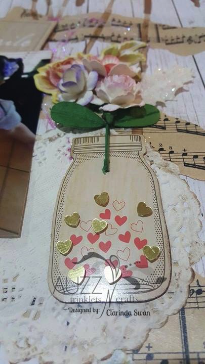 I then added flowers over the top. I wanted the hearts to stand out so I glued some tiny gold hearts onto the jar as well.