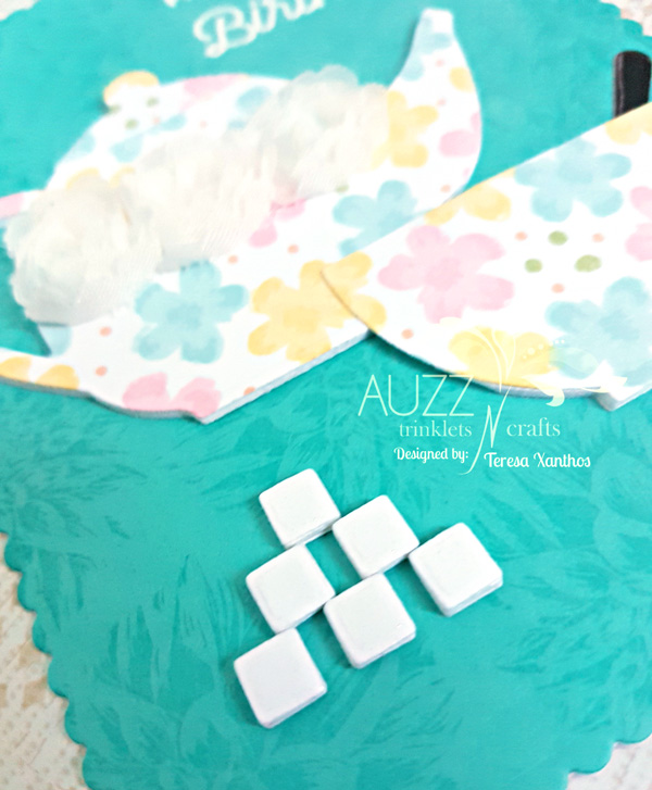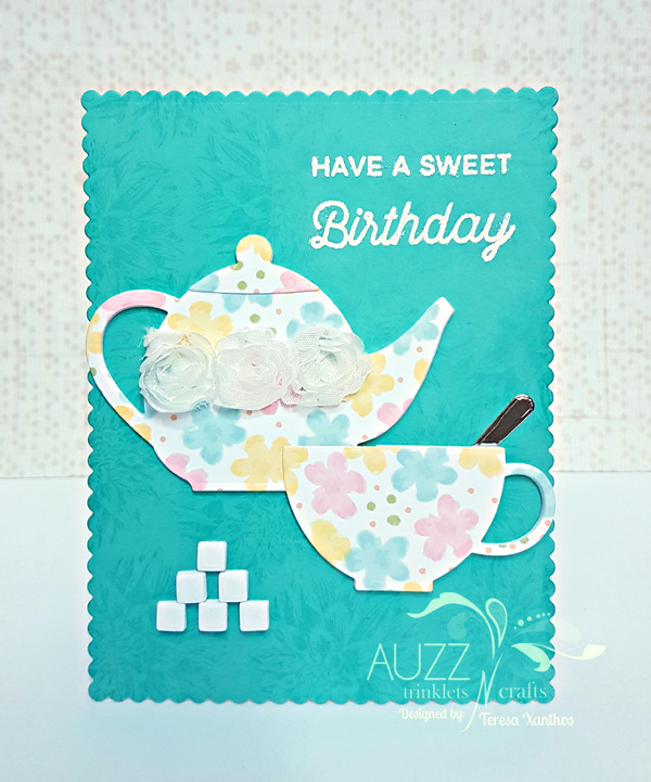 I then die cut multiple (7-8) tea pots, lids, teacups and (42-48) sugar cubes with the dies from plain white cardstock and adhered the pieces together using Ranger Multi Medium Matte to make sturdy embellishments. Before adding the top stamped piece of the tea pot lid and tea cup I cut away a small area of the plain adhered pieces with myTim Holtz scissors to allow the pieces to sit flush over the top of the teapot. I then added the top piece and glued the teapot, lid, cup and sugar cubes into place using Ranger Ink Multi Medium Matte.