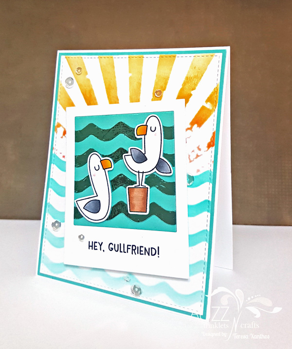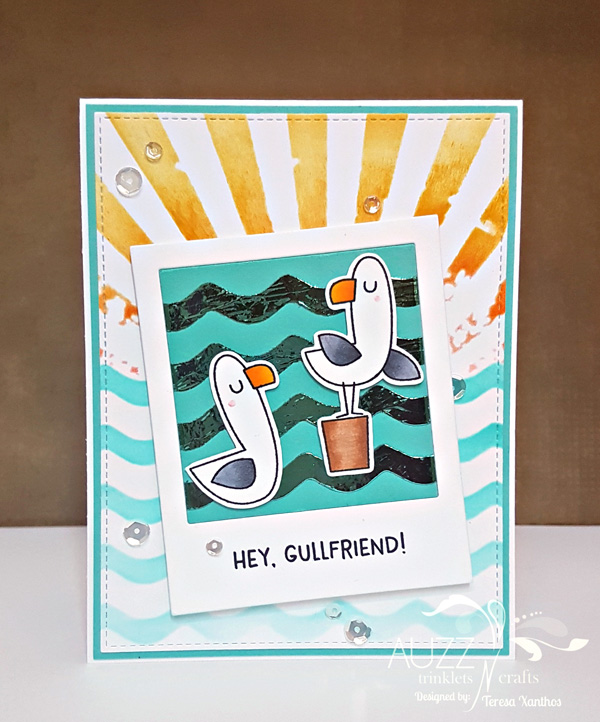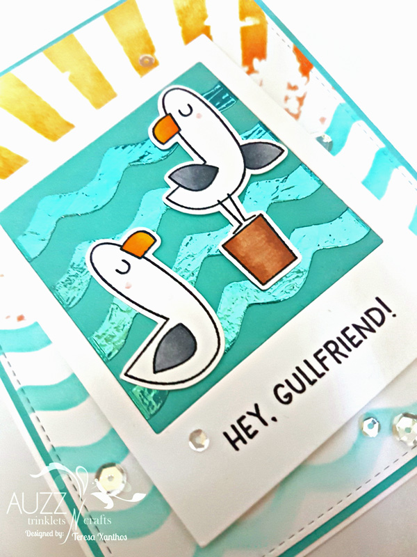 To assemble the card, I adhered the stitched rectangle diecut background onto a slightly larger rectangle piece cut from Gina K. Designs*Thermoweb Turquoise Sea cardstock with a paper trimmer using Kokuyo Glue Tape Roller. I adhered a slightly smaller piece of scrap cardstock behind the polaroid frame and placed the Gina K. Designs*Thermoweb Turquoise Sea cardstock square insert foiled piece to this within the frame and stuck the frame to the background piece using 3M Scotch Foam Tape. I popped the seagulls into position and finished off the card with some Pretty Pink Posh Sparkling Clear Sequins in 4mm and 6mm, adhered with Ranger Multi Medium Matte.