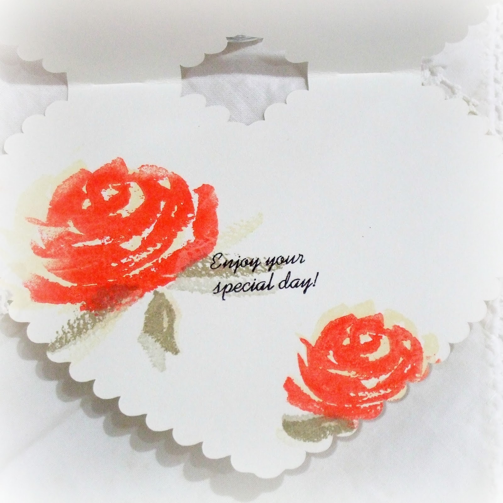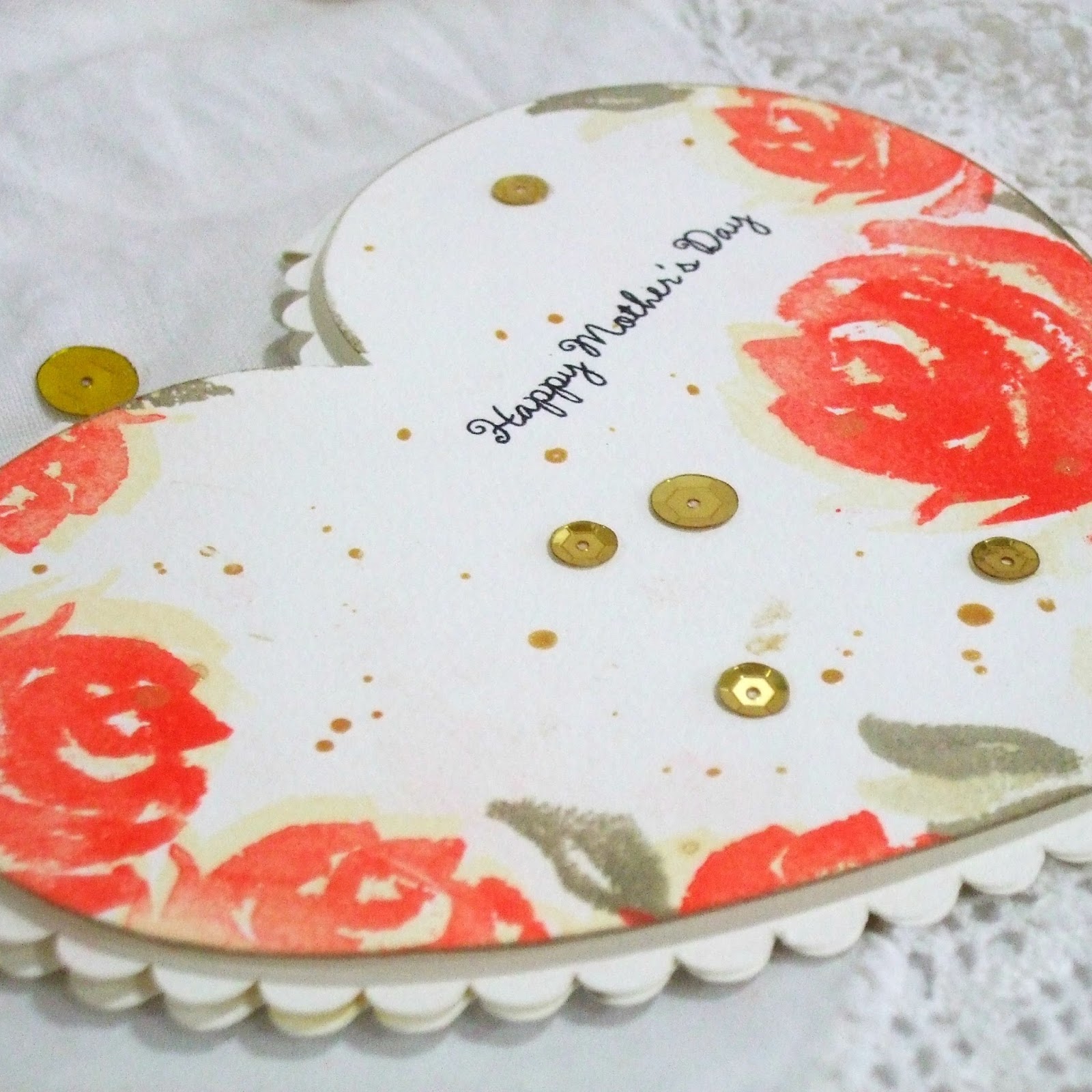 I used chalk inks to stamp the flowers and leaves. The heart shape card was die cut with my cricut using 'Lifes a Party' cartridge. I used foam to mount the top layer to the card for added dimension.