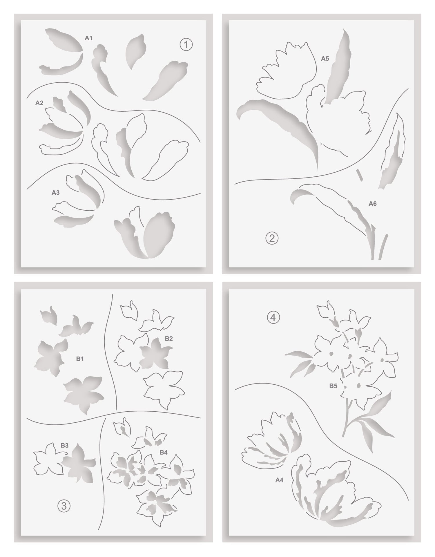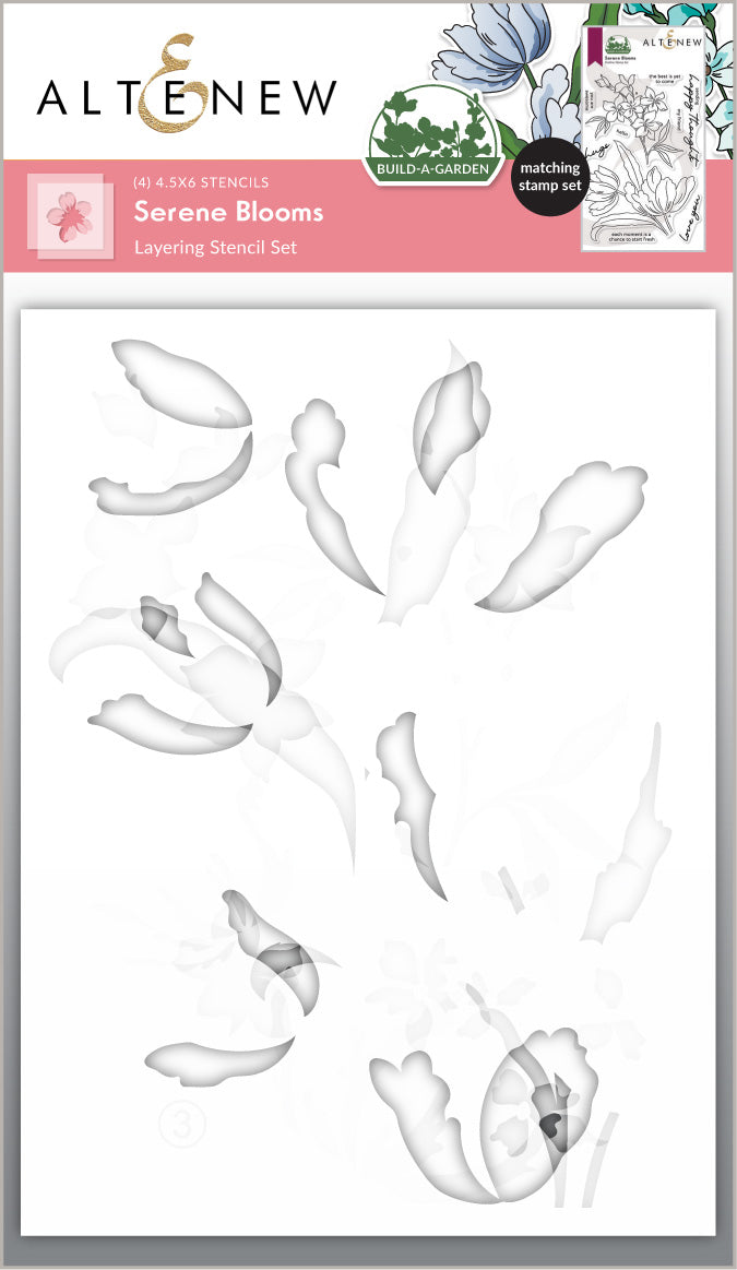 • One 4.5" x 6" layering stencil set with 4 stencils that coordinate with the stamp set