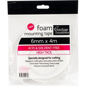Couture Creations-Foam Mounting Tape: High Track. Perfect for creating 3D effects on scrapbooking and crafting projects! Works on metals, glass, wood, paper, plastics and fabric. This package contains 4m of 6mm wide foam mounting tape. Acid and solvent free