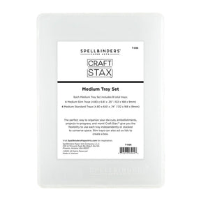 Craft Stax – Medium Tray Set This set includes eight stackable frosted plastic trays that combine to create four medium sized storage boxes. These versatile trays can be used in multiple ways: combine a slim tray with a standard tray to create a storage box, use each tray separately, or stack them all together for a space-saving storage solution.
