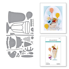 Fountain Wishes Etched Dies are from the Happier Hour Collection. When assembled, this set of 22 thin metal cutting dies creates sweet drinks based on a tall, footed fountain glass. Details include an ice cream scoop and drips to make it real! For extra fun, there are accents to add to set the vibe: straw, cherry, cookie, balloon, and more!