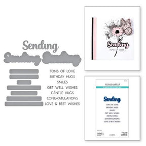 Sending Smiles Sentiments Clear Stamp & Die Set from the Wildflowers Collection by Lisa Horton. The set of one stamp and four thin metal cutting dies includes a 'Sending' word die with its double matted outline. Seven sentiments are stacked on one stamp: Tons of Love, Birthday Hugs, Smiles, Get Well Wishes, Gentle Hugs, Congratulations and Love & Best Wishes. The stamp has a coordinating die that cuts all of the sentiments out in one pass.