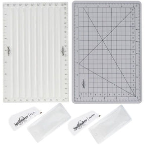 Perfect to use for trimming thin foiled or stamped sentiments! This 7x10.25x.75 inch package contains one self-healing mat, one trimmer blade, one foil blade, one paper blade and two blade covers. Imported.