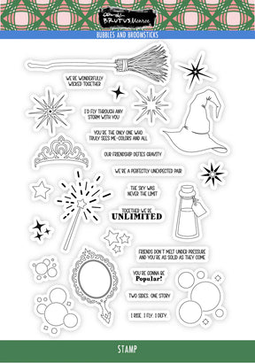 Add a dash of magical mischief to your papercrafting with the Bubbles and Broomsticks 6x8 stamp set. Featuring 28 playful stamps, including a potion bottle, wand, bubbles, broom, stars, and a hand mirror, this set brings whimsical charm to your projects. With sentiments inspired by wicked friendships, these stamps are perfect for conjuring up fun cards and crafts that celebrate magical bonds.