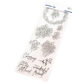 4 x 12 photopolymer clear stamp set designed by Valentine Leclerc. Made to coordinate with the Rainbow Daisies die, Rainbow Daisies layering stencils and Rainbow Daisies washi tape. Available for purchase separately. This innovative stamp includes all the beautiful Rainbow Daisies wreath & clusters on one stamp, so it pairs perfectly with the 1-piece coordinating die. The 1-piece stamp is slightly smaller than 8 ½” and should fit in a standard stamping platform. It will likely fit at an angle in a standard stamping platform, or in a larger stamping platform. You can also use the hinged lid method that we have showcased in our Tips & Tricks section on our YouTube channel. Stamp the Rainbow Daisies outline images in all the different ink choices, including detail black, fadeout ink or heat emboss for some added shine. Then color them with your favorite medium, ink blend with the coordinating layering stencils or use them as just the outline for a modern feel. The clusters are perfect for all types of coloring; including watercolor, alcohol & brush markers, colored pencils and no-line coloring. Finish your card off with an encouraging sentiment featured in this whimsical slimline sized stamp set! The following sentiments are included in the stamp set: -Cheering you on -Keep your chin up -Even on tough days you are still loved -You’re a wonderful friend