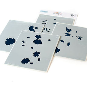 4 piece layering stencil set made to coordinate with the Happy Blooms Floral stamp set and Happy Blooms Floral die. There is a separate stencil for each layer, with guidelines on each stencil for perfect alignment every time. Use them without the stamped image for a soft, no-line coloring feel. Use the coordinating stamp to add more detail to the image by stamping in detail black, or heat embossing in gold.
