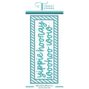 This slimline die set has a single that die cuts a diagonal striped frame around the perimeter of the panel. The panel features an embossed edge on either side of the diagonal frame. Also included is a die that cuts out 4 different words, "Yippee", "hooray", "woohoo", and "wow" in a script font.