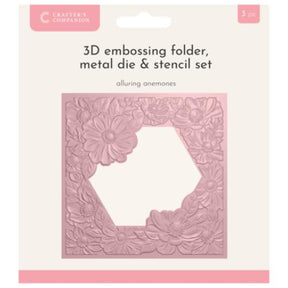 Create romantic crafts and projects with the Alluring Anemones 3D Embossing Folder, Metal Die and Stencil Set from Crafter's Companion. This set includes an embossing folder, a template, and a metal die to create a gorgeous frame for a handmade greeting card of a hexagon surrounded by anemones. Die cutting gives a level of delicacy to cut-out designs that simply couldn't be created with scissors or a craft knife. Embossing folders are ideal for the background of cards or to create dimensional toppers for gift boxes by cutting the design out of card, you can also add colour using inkpads for added effect. 3-piece set includes an embossing folder, a template, and a metal die of an anemone. Folder size: 5.5" x 5.5" (14cm x 14cm); Template size: 5.5" x 5.5" (14cm x 14cm); Die size: 3.9" x 3.5" (9.9cm x 8.9cm). Compatible with the Mini, Midi, Junior, and Gemini II die cutting and embossing machines.
