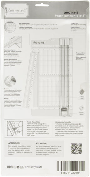 Dress My Craft Paper Trimmer has a base of 6 x 12 inches with an extending arm to 17 inches. Measurements are in both English and Metric. It comes with a cutting blade and a scoring blade. The cutting blade has a marking to align on the ruler to easily cut a window in the center of a paper. Ideal for cutting papers, cardstocks, photographs, all weights of paper up to 300 gsm, thin foam sheets and plastic sheets. Anti-slip rubber to keeps the trimmer from moving on a tabletop. Additional blades (DMCT4427) are available to buy separately. A great companion for all crafters to carry in their bags for workshops.