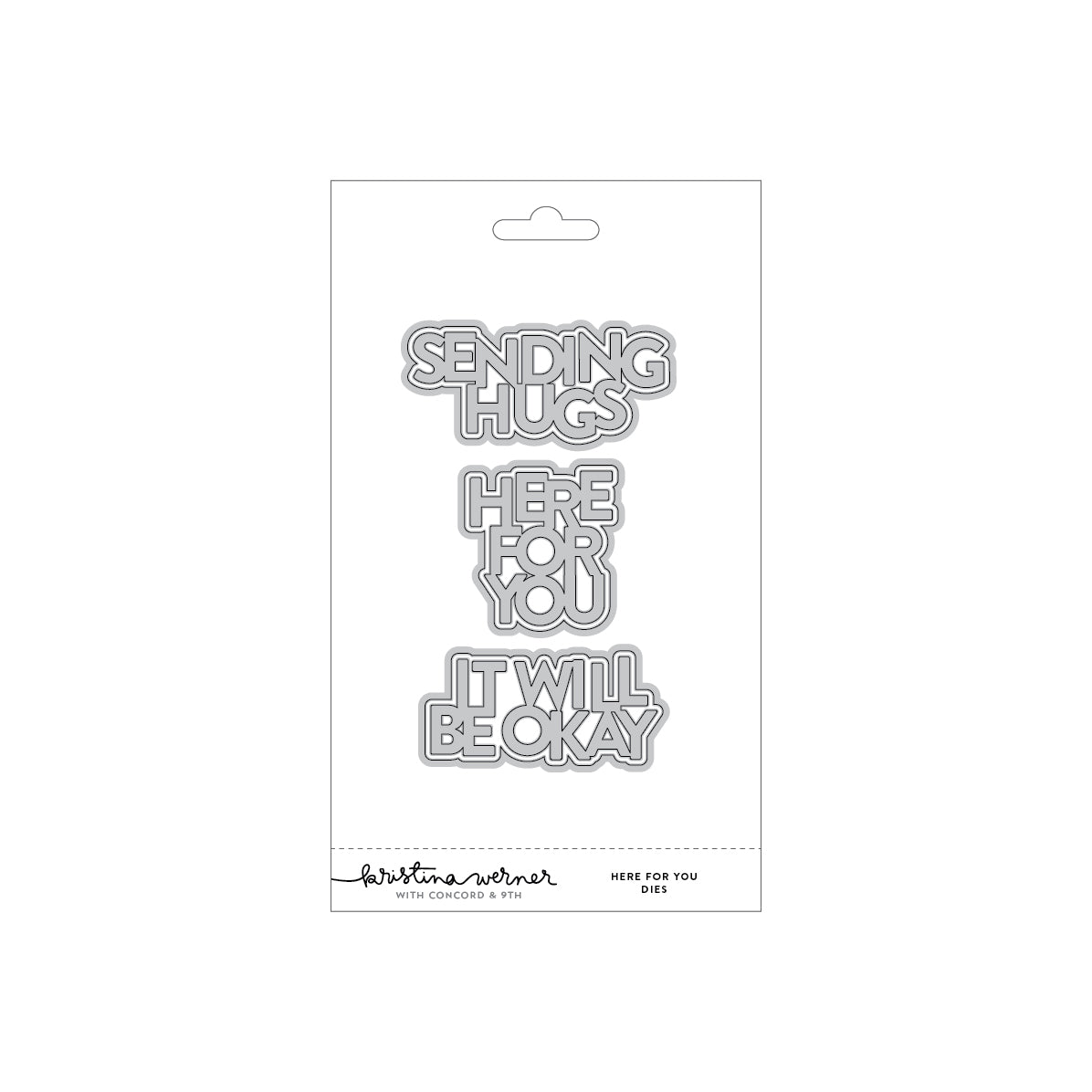 The Here For You Dies includes three sentiment dies — Sending Hugs, Here for You, and It Will Be Okay — each with a coordinating outline. Perfect for adding clean, bold greetings to encouragement and thinking-of-you cards. 6 pieces.
