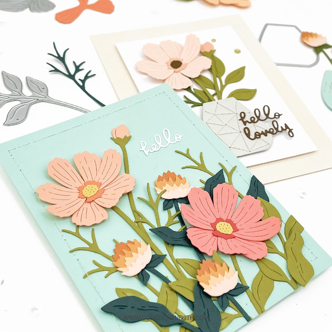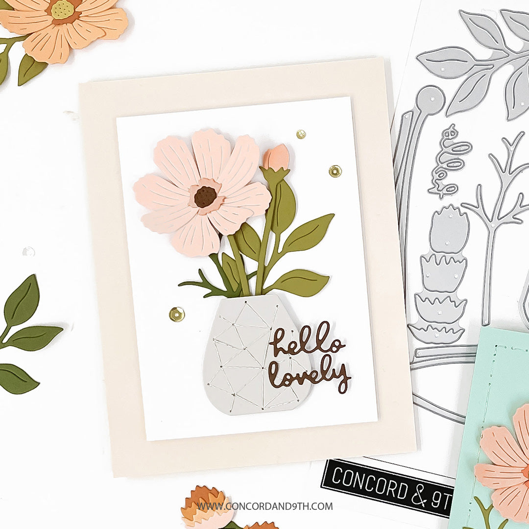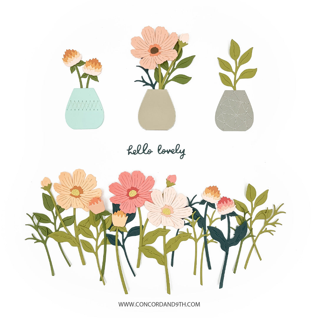 Mix, match, layer, and even stitch with the Just Picked Dies! This sweet set makes it easy to create cheerful, dimensional flowers for any project. The larger Cosmo flower die cuts four individual petals that you can assemble by aligning the center cutouts and adding the coordinating flower centers. The Globe flower is cut with a single pass through your die cutting machine and the pieces layer from tallest to shortest. There are stem and leaf options, plus a charming decorative pot. Take your card to the next level by using one of the piercing dies to create an easy-to follow stitching guide that allows you to add metallic designs to the pots. 16 pieces.