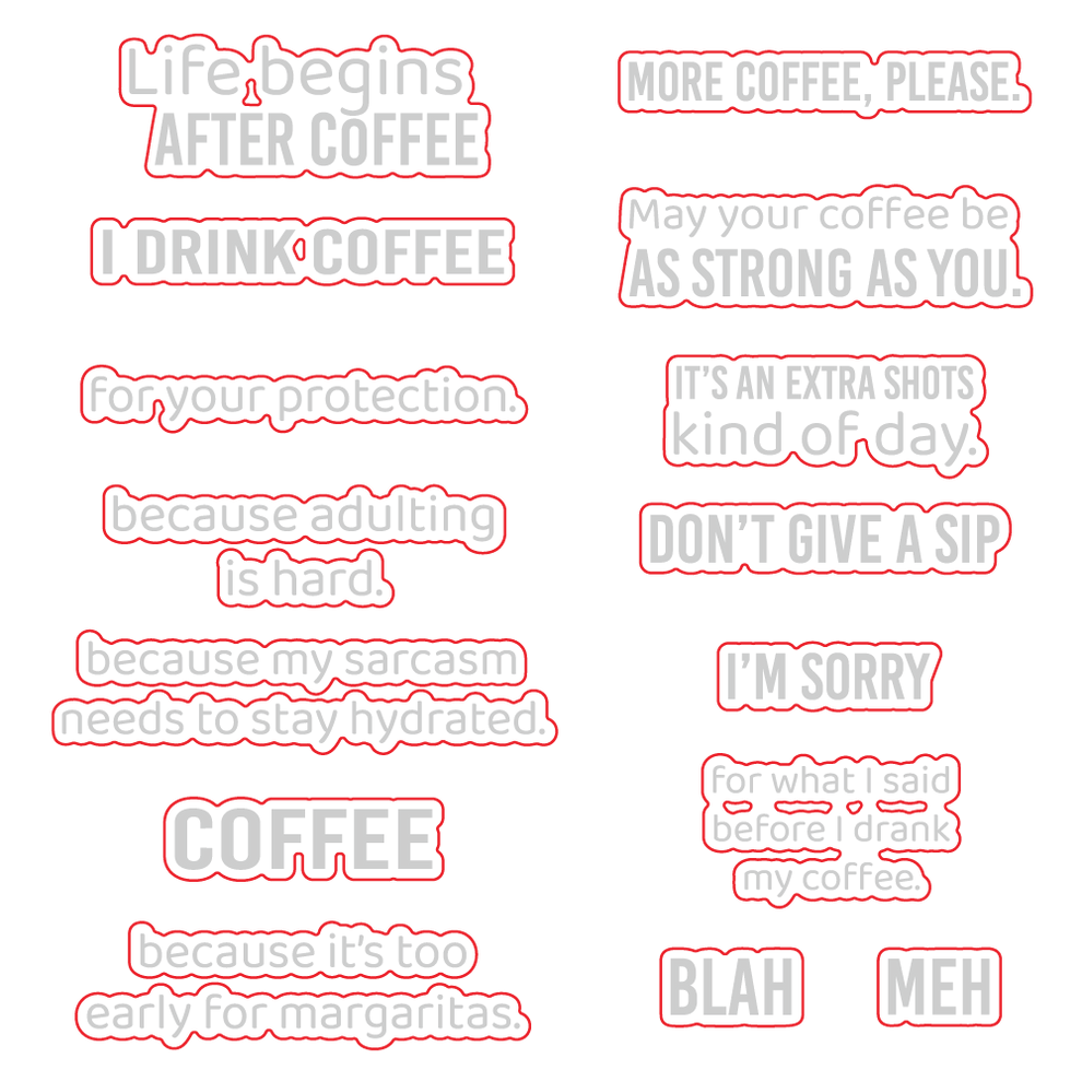 This 15-piece 4"x6" clear photopolymer stamp set is ideal for sharing caffeine vibes and a touch of sass with your favorite coffee enthusiasts. Crafted with care and high-quality photopolymer, proudly designed and made in the USA.