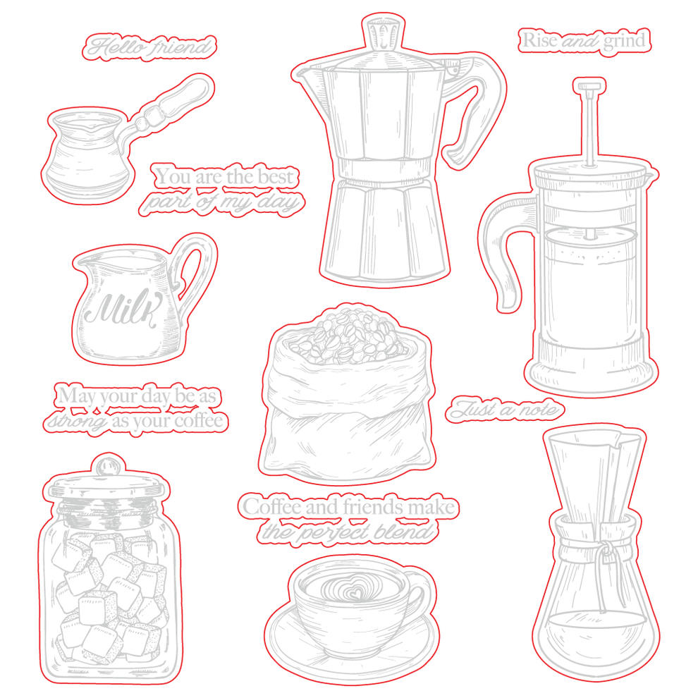 This 14-piece 6" x 8" rubber cling stamp set brings a lively coffee vibe with its detailed, realistic designs that are perfect for brewing up creative projects. Made with Love in the USA!