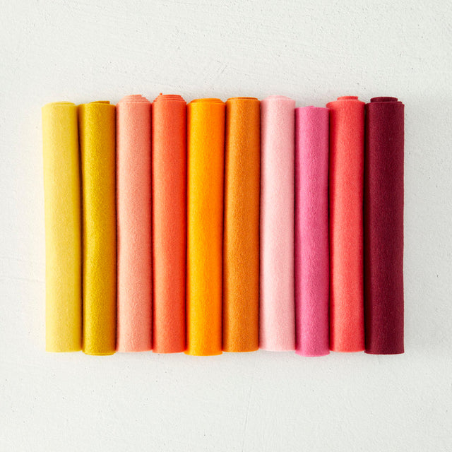 Merino Wool Felt Sheets - Warm Collection is 100% Merino Wool felt material and comes in a pack of 10 assorted colors. The colors include one each of Beeswax, Amber, Flamingo, Coral, Tangerine, Pumpkin, Taffy, Raspberry, Azalea, Velvet.