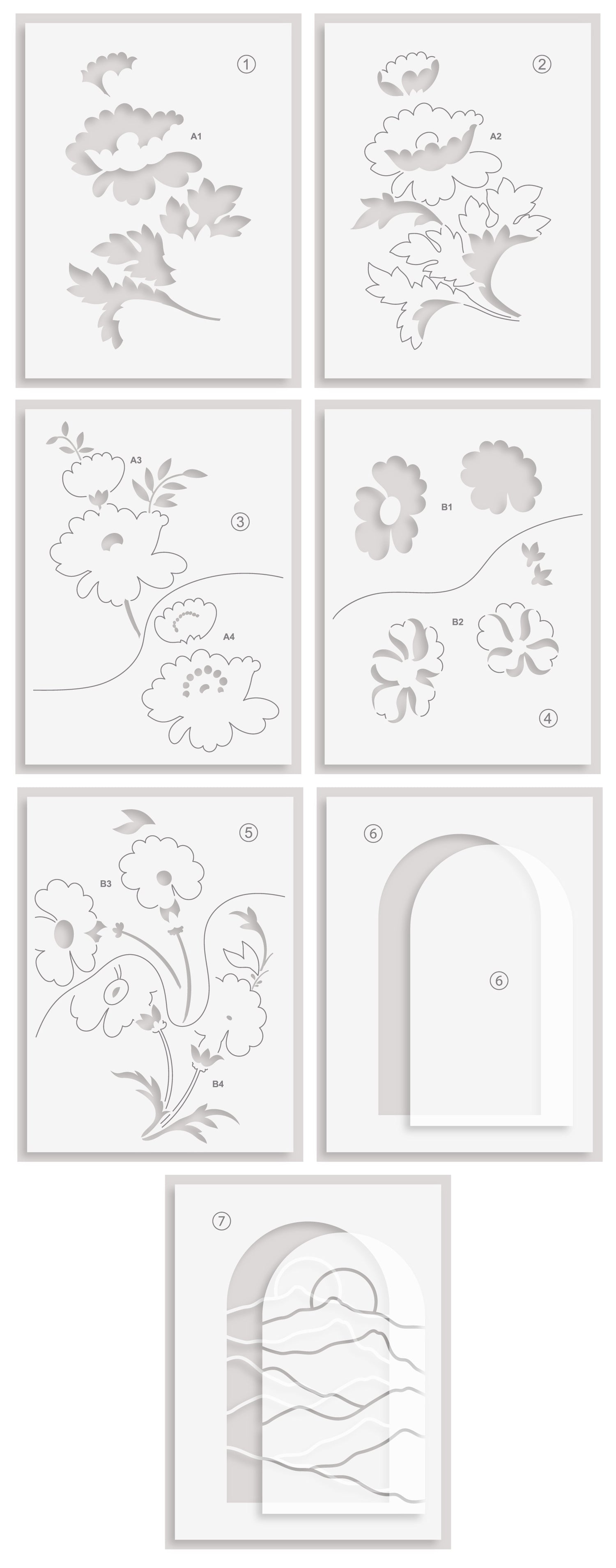 • One 4.5"" x 6"" layering stencil set containing 7 stencils