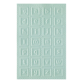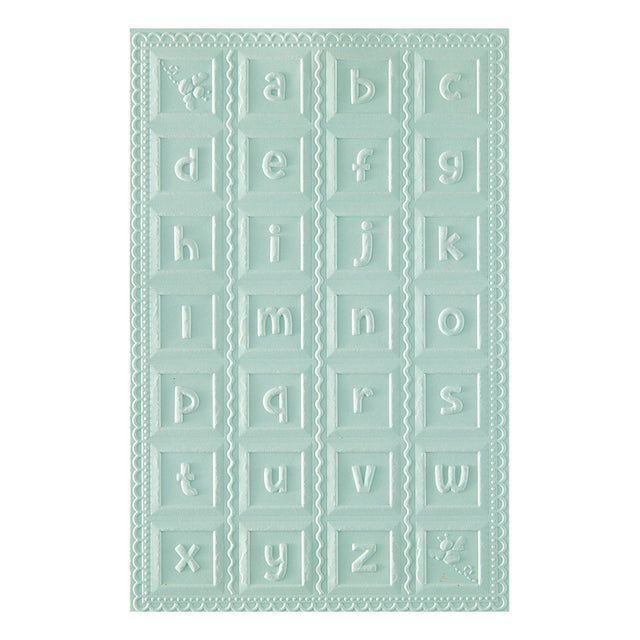 Classic Pooh Baby Blocks 3D Embossing Folder is a 5.50 x 8.50-inch embossing folder with a wonderful background filled with lower case alpha blocks and two buzzing bee blocks framed in a sweet loop design. For interest, punch out the blocks with T-081 1-inch Square Punch (sold separately) and pop them up with foam squares or use individually.