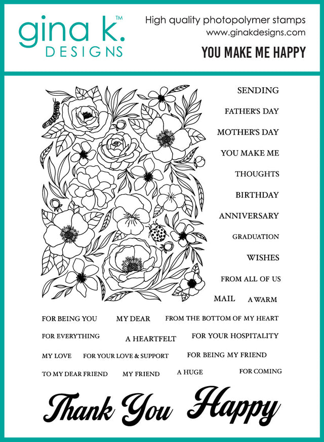 You Make Me Happy is a stamp set by Hannah Drapinski. This set is made of premium clear photopolymer and measures 6" X 8". Made in the USA