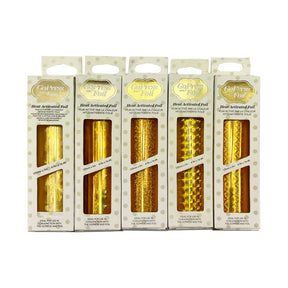 Includes 5 Foil Rolls | 125mm x 5m | 4.9in x 16.4ft - Includes CO725356 Gold speckled pattern, CO726074 Gold spiral pattern, CO726077 Gold square pattern, CO725357 Gold shavings pattern & CO726063 Gold triangular pattern