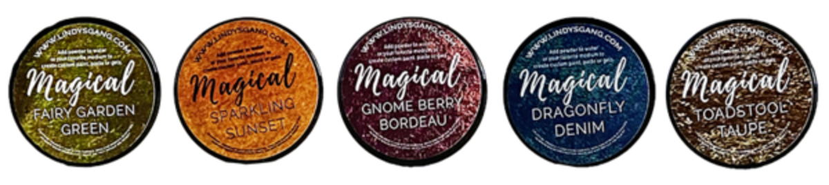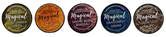 The dynamic duo that is Nuneka and Frau Pony are at it again, with this gloriously rich, earthy set! Inspired by sunsets in the woods in autumn, these colors will dazzle you with their deep rich beauty! Designed for use on everything from paper to wood, the dye-based powders are non-toxic and acid-free. Sprinkle them directly onto a porous surface and spray it with water for a vibrant stain, or mix them into different mediums to create potent pastes. 0.25oz jar. Non-toxic, acid-free powdered dyes. Contains pearlized mica powders, powdered dye based pigments & a fixative. Made in the USA. The Enchanted Forest set includes: Toadstool Taupe- deep, rich brown with a sparkly gold shimmer; Dragonfly Denim- a dark, denim-y navy blue with a beautiful blue shimmer; Gnome Berry Bordeaux- a deep, brownish burgundy with a burgundy shimmer; Sparkling Sunset- super vibrant orange-y yellow with a sparkly gold shimmer; Fairy Garden Green- a perfect brownish green with a rich golden shimmer.