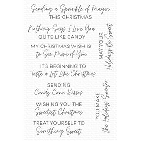 Christmastime is a season of sweetness, and this delectable assortment of holiday wishes provides perfect sentiment options for celebrating appropriately. These greetings are ideal for pairing with your homemade treats and hostess gifts or for accenting with a range of delicious die-cut treats, including the Sweet Sticks – Holiday Edition die set that features candy canes, seasonal lollipops, and festive accents. You’ll adore the fun font mix that marries a pretty script look with a classic sans serif. Our clear stamps are made in the USA and include the name of the set on the sticker for easy identification. October 2023 Release - 4" x 6" clear stamp set – (9) piece set Sending a Sprinkle of Magic This Christmas 3 3/8" x 5/8" Nothing Says I Love You Quite Like Candy 2 7/8" x 5/8" My Christmas Wish Is to See More of You 2 1/2" x 5/8" It's Beginning to Taste a Lot Like Christmas 2 3/4" x 5/8" Sending Candy Cane Kisses 2" x 5/8" Wishing You the Sweetest Christmas 2" x 5/8" Treat Yourself to Something Sweet 2 1/8" x 5/8" May Your Holidays Be Sweet 2" x 5/8" You Make the Holidays Sweeter 2 1/4" x 5/8"