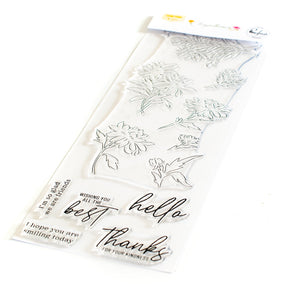 4 x 12 photopolymer clear stamp set designed by Valentine Leclerc. Made to coordinate with the Chrysanthemum die, Chrysanthemum layering stencils and Chrysanthemum washi tape. Available for purchase separately. This innovative stamp includes all the floral clusters on one stamp, so it pairs perfectly with the 1-piece coordinating die. The 1-piece stamp is slightly larger than 8 ½”. It will likely fit at an angle in a standard stamping platform, or you will need to use a larger stamping platform. You can also use the hinged lid method that we have showcased in our Tips & Tricks section on our YouTube channel. Stamp the Chrysanthemum outline images in all the different ink choices, including detail black, fadeout ink or heat emboss for some added shine. Then color them with your favorite medium, ink blend with the coordinating layering stencils or use them as just the outline for a modern feel. The clusters are perfect for all types of coloring; including watercolor, alcohol & brush markers, colored pencils and no-line coloring. Finish your card off with a friendly sentiment featured in this beautiful slimline sized stamp set! The following sentiments are included in the stamp set: -I’m so glad we are friends -Wishing you all the best -hello -I hope you are smiling today -thanks for your kindness