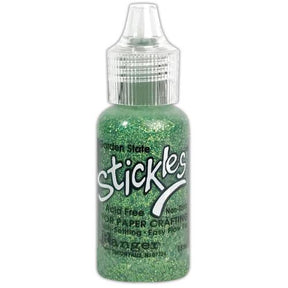 A plastic bottle glitter glue. Non-setting and featuring an easy flow tip. Makes your art sparkle and enhances rubber stamped designs, adds excitement to greeting cards, letters, envelopes, holiday and party decorations. Available in a variety of colors, each sold separately. This package contains one Ranger Stickles, 0.5 ounces. Acid free, non-toxic. Conforms to ASTM D4236. Made in USA.