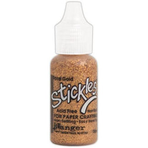A plastic bottle glitter glue. Non-setting and featuring an easy flow tip. Makes your art sparkle and enhances rubber stamped designs, adds excitement to greeting cards, letters, envelopes, holiday and party decorations. Available in a variety of colors, each sold separately. This package contains one Ranger Stickles, 0.5 ounces. Acid free, non-toxic. Conforms to ASTM D4236. Made in USA.