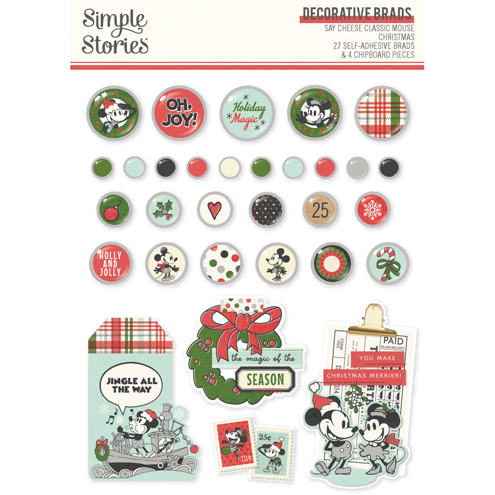 Simple Stories Say Cheese Classic Mouse Christmas - Decorative Brads includes 27 self-adhesive enamel brads in assorted sizes and colors, plus 4 coordinating chipboard pieces to capture the charm of classic cartoons and holiday theme fun. These brads and chipboard accents are perfect for embellishing scrapbook pages, cards, and DIY keepsakes. Add texture, shine, and retro personality to your creative projects because every magical memory deserves a bold and joyful touch!
