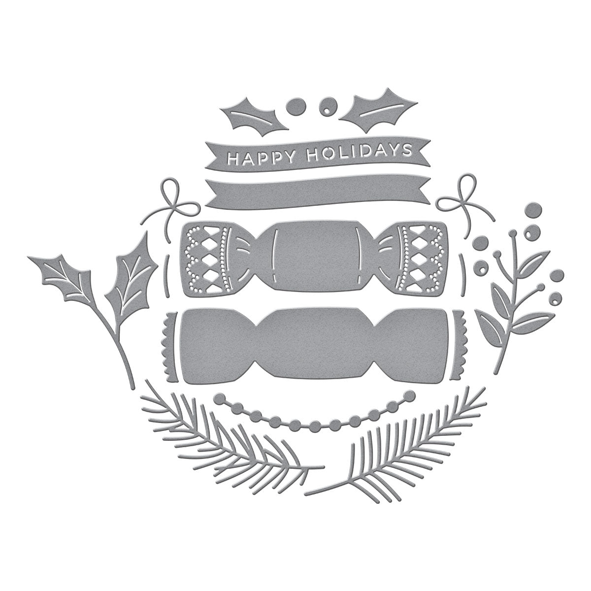 Christmas Cracker Etched Dies are from the City Holiday Collection by Yana Smakula. Assembled, this set of 14 thin metal cutting dies creates a wonderful Christmas cracker to celebrate the holidays! To add to the motif, there are holly berries and leaves, pine needles, sprigs and a Happy Holidays banner to finish the set.