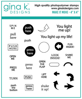 Make it Move is a stamp set by Gina K Designs. This set is made of premium clear photopolymer and measures 4" X 4". Made in the USA