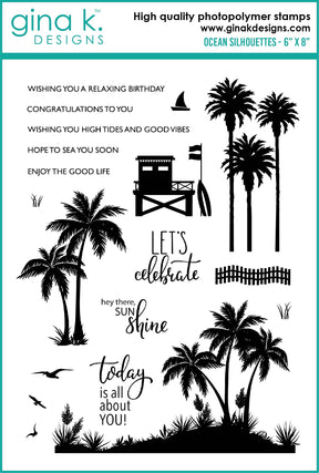 Ocean Silhouettes is a stamp set by Gina K Designs. This set is made of premium clear photopolymer and measures 6" X 8". Made in the USA