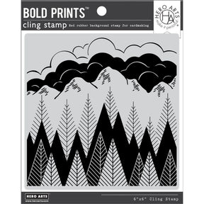 A graphic representation of trees, mountains and clouds. Beautiful when stamped, and absolutely stunning when heat embossed with bold, metallic colors. Measuring 6 x 6 inches, Bold Prints background cling stamps are large enough to fully cover an A2 card and can be rotated for use in any direction. All Hero Arts Cling stamps are made with deeply etched red rubber for precise stamping. They cling to an acrylic block, and clean up easily with water or stamp cleaner. Artist tip: Use without a block! Place rubber face up, apply ink to the design, and then press the paper to the inked rubber. Handmade in the USA.