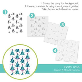 It's time to celebrate, so grab the Party Time Stamp & Stencil Combo and start crafting! The red rubber background stamp features a fun pattern of party hats with stripes and polka dots, and the three stencils make it easy to color those in and add sprinkles and confetti all around them! Perfect for birthdays, graduations, retirement and more!