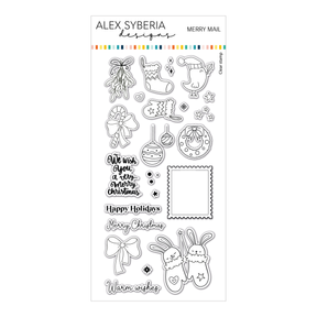 The Merry Mail Stamp Set by Alex Syberia Designs (DL/4*8 stamp) is a festive clear stamp set filled with holiday icons, sentiments, and cute details. It includes stockings, mittens, ornaments, a wreath, bows, candy canes, mistletoe, stars, and playful greetings β everything you need to create joyful Christmas projects.