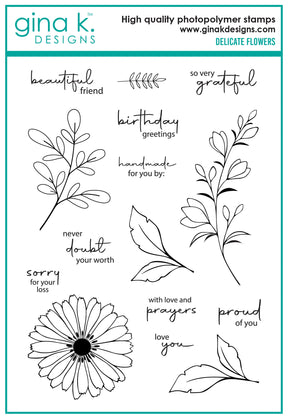 Delicate Flowers is a stamp set by Gina K Designs. This set is made of premium clear photopolymer and measures 6" X 8". Made in the USA
