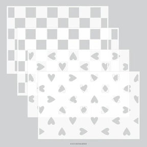 Sized perfectly for A2 cards (4.25” x 5.5”), A7 cards (5” x 7”) and even larger projects, the Missing Your Hugs Stencil Pack includes four stencils to create a colorful checkerboard pattern with hearts. Four 6" x 9" stencils.