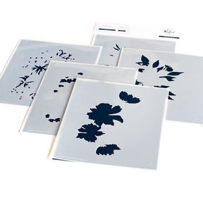 5 piece layering stencil set made to coordinate with the Cosmos Bunch stamp set and Cosmos Bunch die. There is a separate stencil for each layer, with guidelines on each stencil for perfect alignment to a 4 ¼” x 5 ½” panel every time. Use them without the stamped image for a soft, no-line coloring feel. Use the coordinating stamp to add more detail to the image by stamping in detail black, or heat embossing in gold. PLEASE NOTE: when using the stencils with the stamped image, you will not use the alignment guides. Instead, you will line up each stencil to the stamped image.