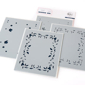 When using the stencils with the stamped image you will forego the alignment guides, and instead align each layer to the stamped images. While you can use them without the stamped image for a more abstract look, this set is more complete with the coordinating outline image found in the stamp set & press plate.